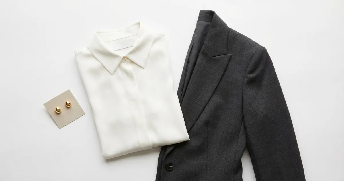 - テーラードジャケット(ブラックまたはネイビー)+シンプルなブラウス(シルク素材が理想)